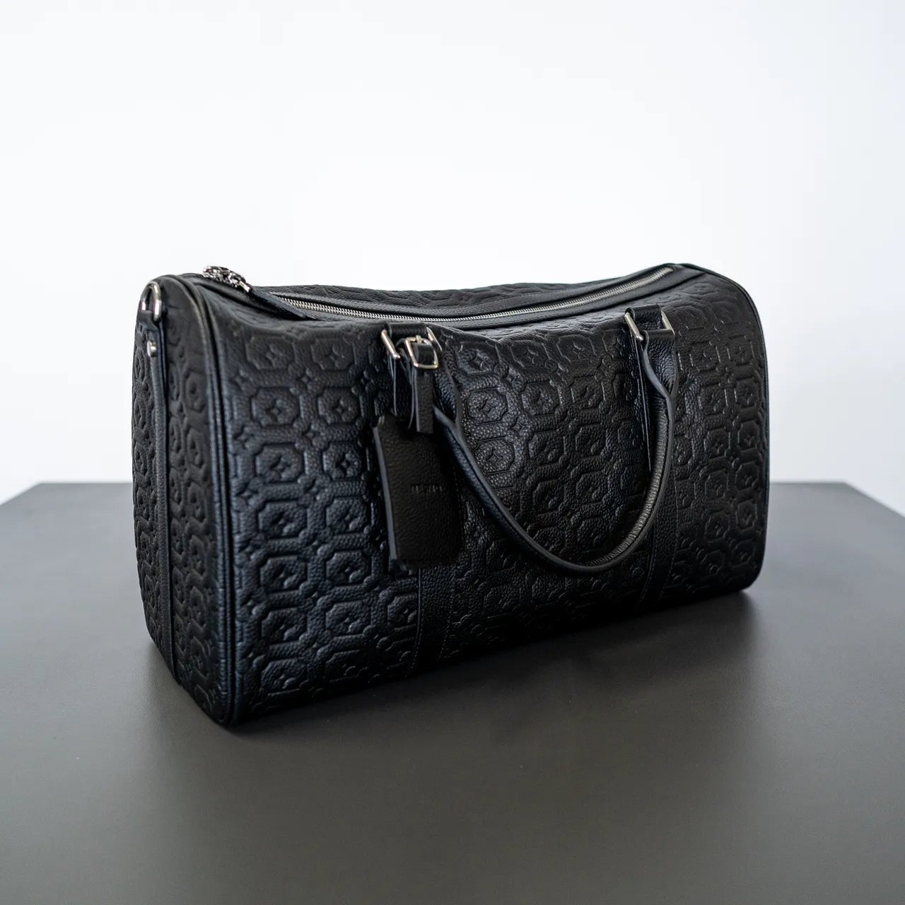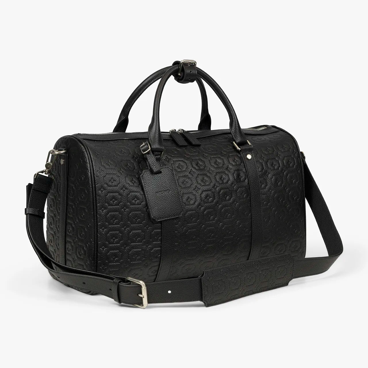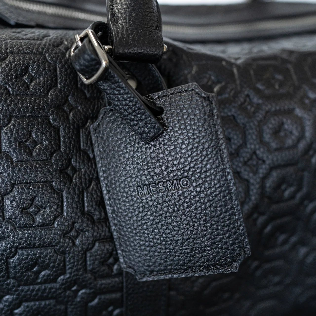 Mesmo duffle bag in black made from premium leather. Debossed Mesmo pattern throughout. Signature shaped adjustable shoulder strap. Mesmo engraved luggage tag. Matte silver hardware. Material: 100% Premium Leather.