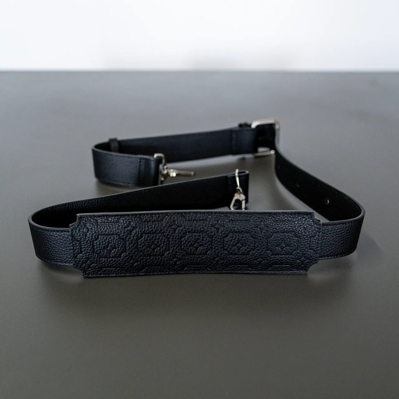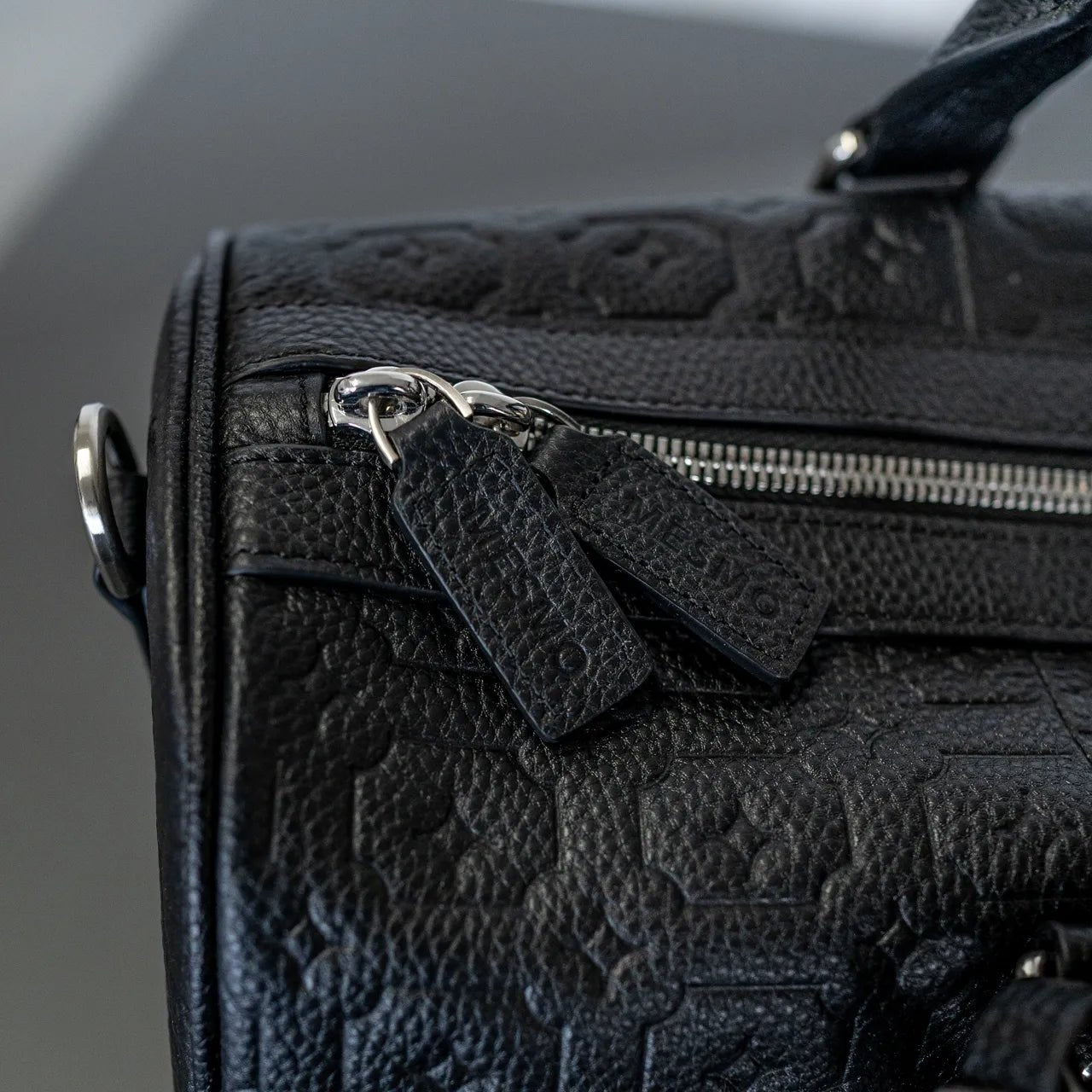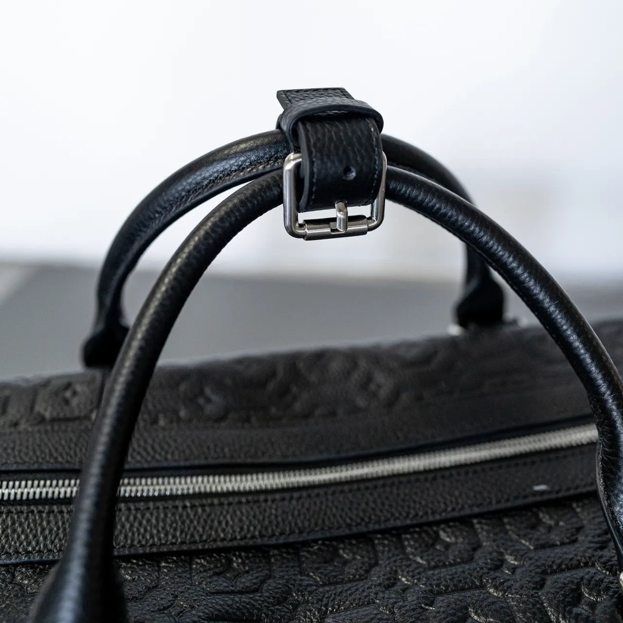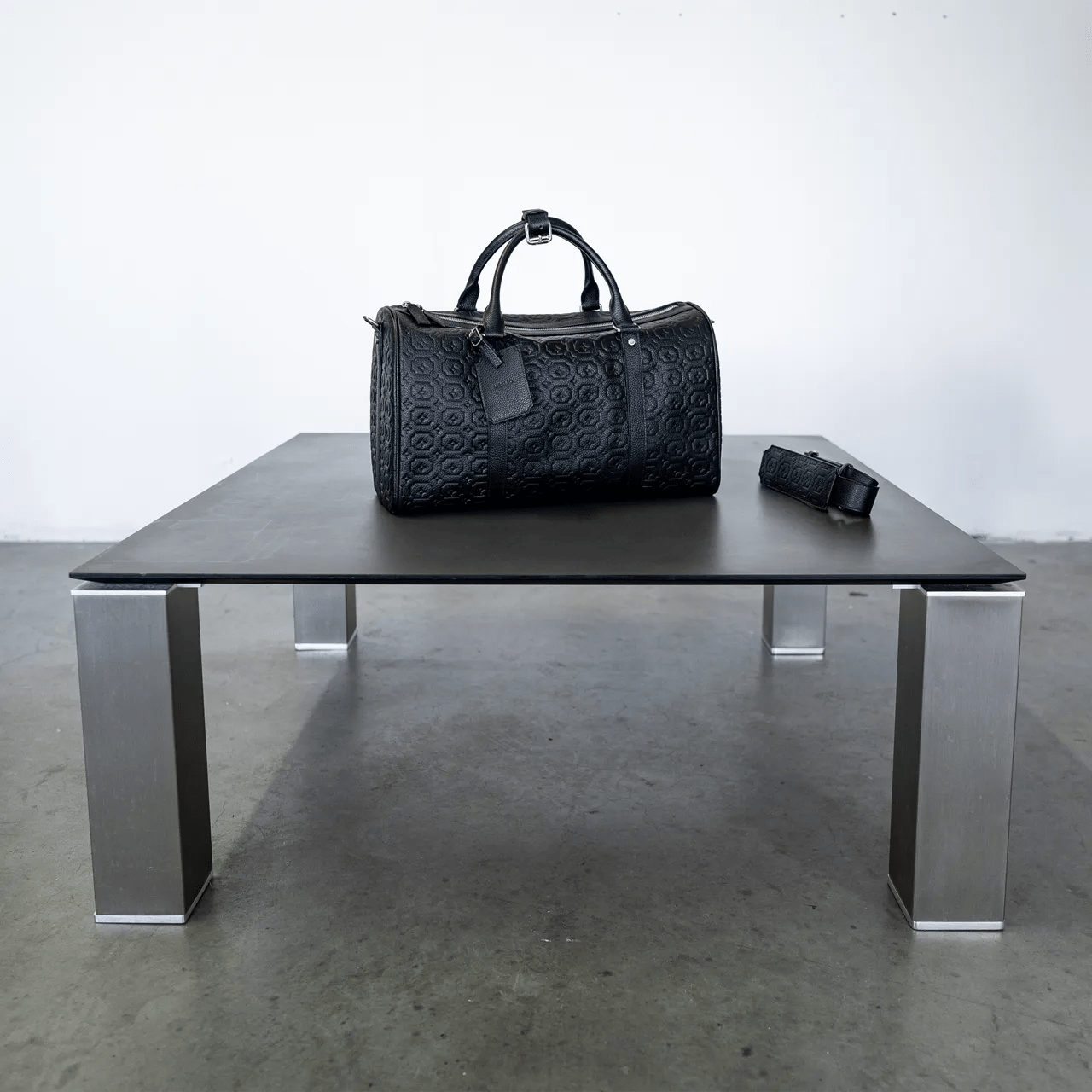 Mesmo duffle bag in black made from premium leather. Debossed Mesmo pattern throughout. Signature shaped adjustable shoulder strap. Mesmo engraved luggage tag. Matte silver hardware. Material: 100% Premium Leather.