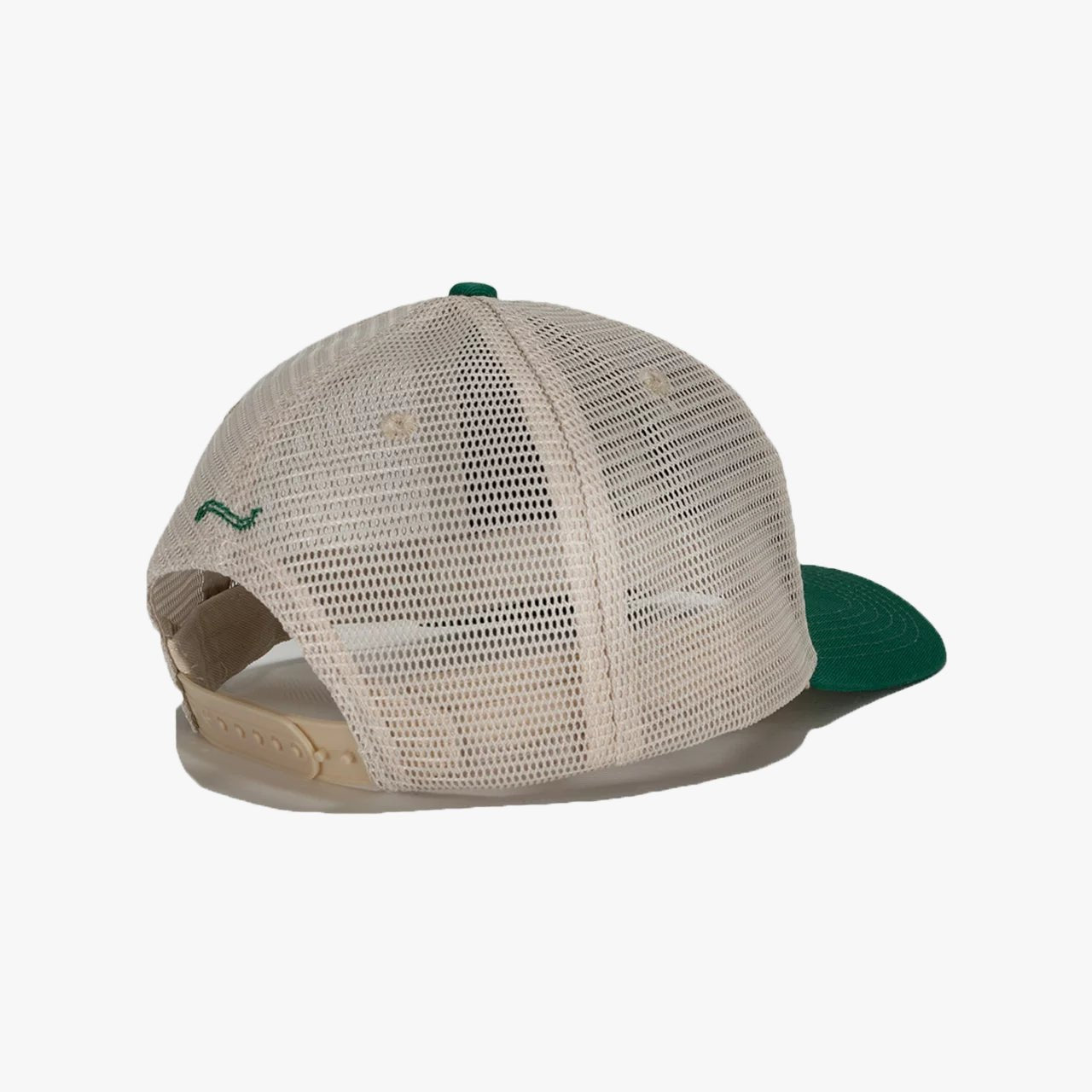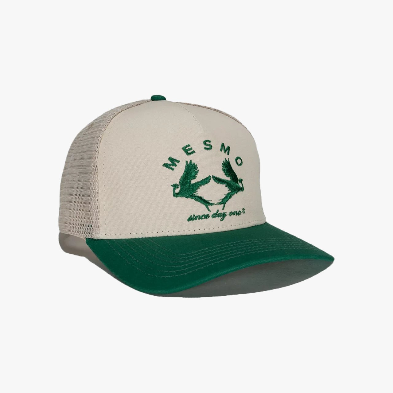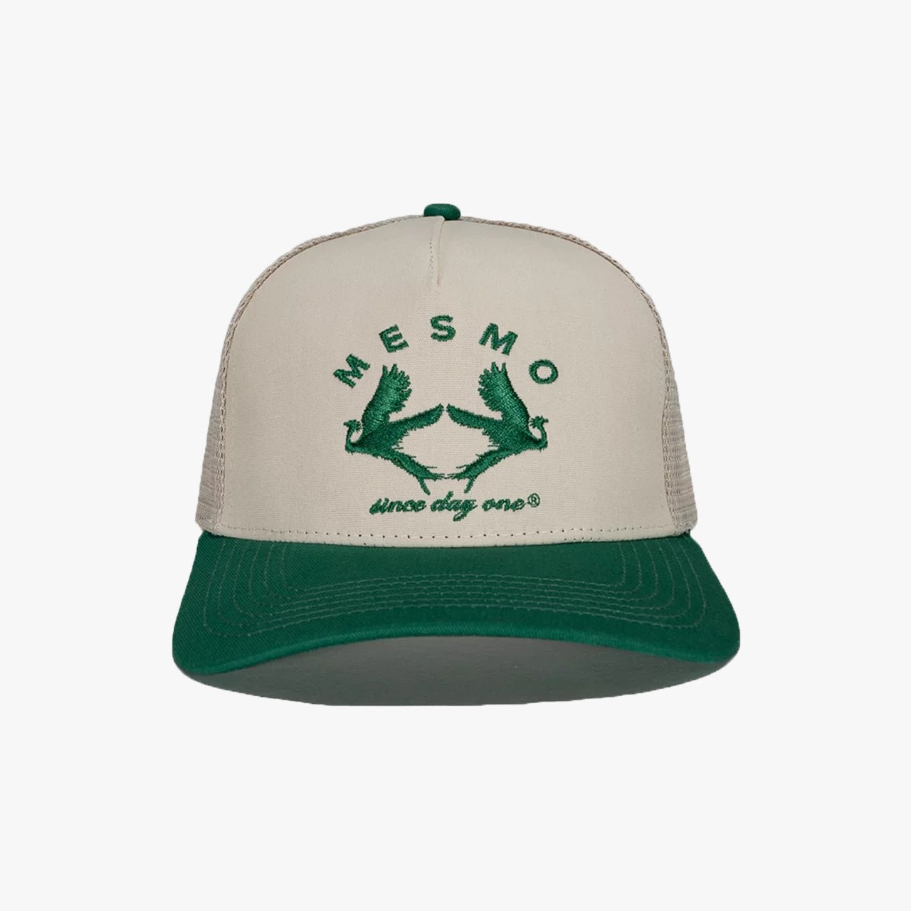 Mesmo phoenix trucker hat in green and buttercream with “Mesmo since day one” and Mesmo phoenix logo embroidered in green at front. Mesmo ~ blur the line ~ logo embroidered in green at back.